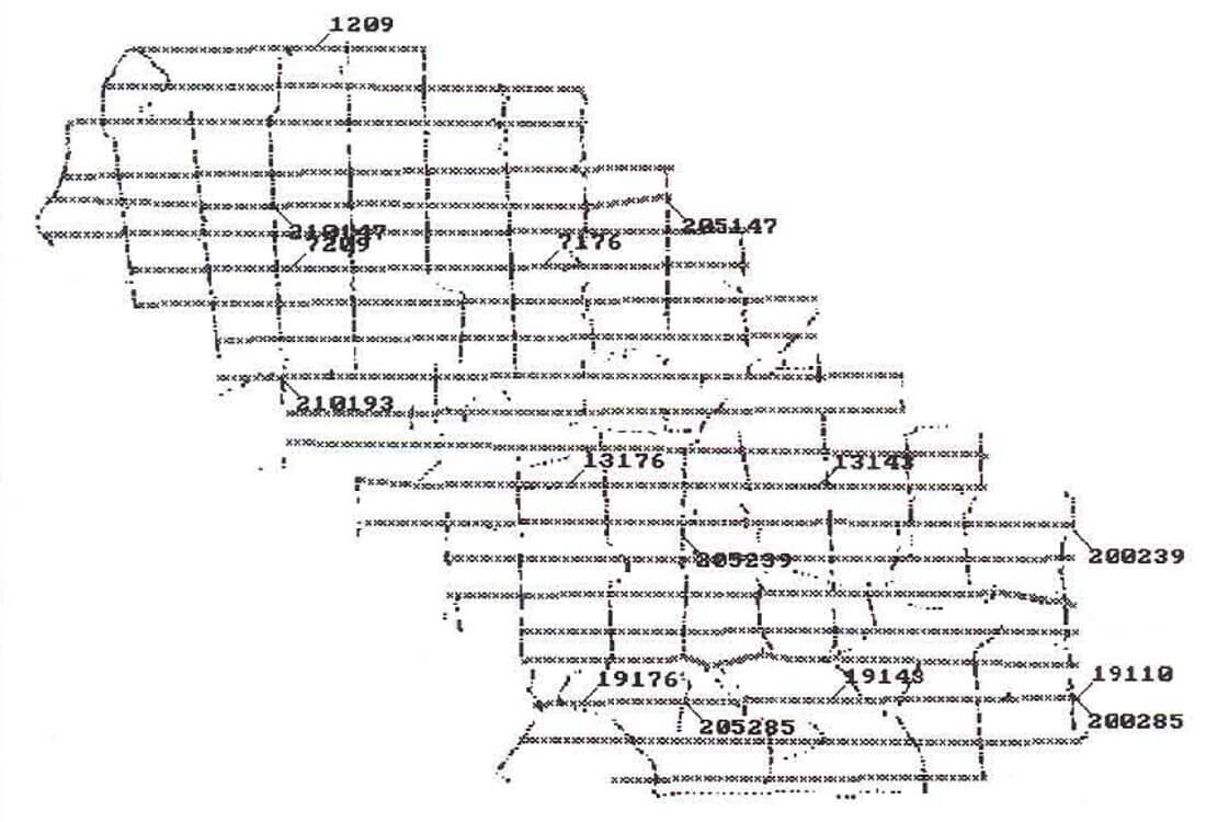 Before the example 3-D was shot, the designer made a careful analysis of the CMP fold for different offset ranges. This revealed some severe inadequacies in the fold of the near traces (0 - 800m). The fold for offset range 800 - 1600m showed no real problems, as did the fold for 1600 - 2400m. Extra shots were added in various places to cure these problems - and to compensate for real life problems - namely a small lake in the South East comer and a river which cut right through the centre of the survey. Digitiser input from maps eased this task. Shots were moved, added etc. and the resulting fold maps for the various offset ranges recalculated.