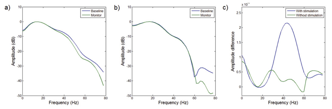 Figure 4 shows time-variant amplitude spectra and their difference for a single trace extracted from the baseline and monitor surveys in an area with and without stimulation, where the reservoir interval is approximately between 1.6 and 1.7 seconds. In the area without stimulation, a minimal amplitude difference is observed throughout the reservoir interval. Conversely, in the area with stimulation, a finite amplitude difference is observed that extends throughout the reservoir interval and is isolated to a specific frequency band. Figure 5 shows a slice through the time-variant spectra in the reservoir interval where these effects are more clearly seen. The difference amplitude spectrum demonstrates a decrease in amplitude that peaks at some frequency and falls off thereafter.