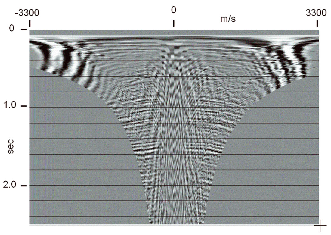The advantage of RT filtering methods is that a filter can easily and intuitively be fitted to the actual noise present on a shot gather, just by matching the ‘pattern’ of the noise with that of the RT transform. For noise obviously originating at the source, the RT fan filter, as described above, is quite effective. For repeated sub-parallel noise events with a nearly constant velocity (for which fk filtering is especially well suited) we can pretend that these events have a ‘virtual source’ at some large offset distance from the actual source, and can construct a ‘thin fan’ radial transform whose trajectories have the correct velocity to capture the parallel noise events. In the ‘thin fan’ mode, an RT filter pass is a very effective dip reject filter, which does not smear traces.