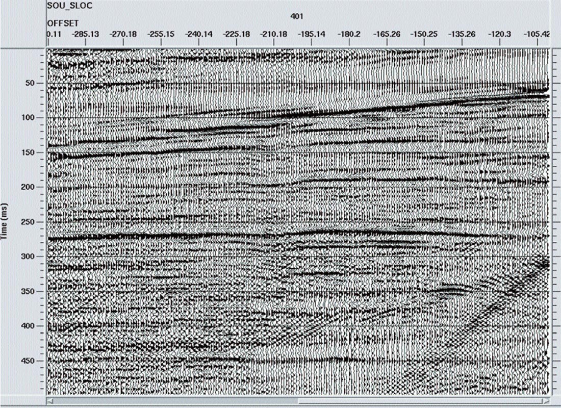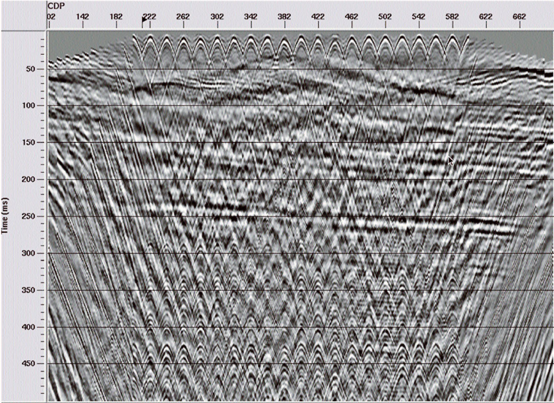 Since we usually use the RT filter technique in the ‘estimate and subtract’ mode, it can be used several times in succession on the same trace gather to remove specific noises one at a time. We usually first apply a fan filter with origin at the source point. After removal of this first layer of noise, we can often see specific linear events or parallel series of events whose velocity can be determined and used to design a thin fan or ‘dip’ filter to remove them. We find that even shot gathers whose reflections are literally ‘buried’ in noise can be filtered remarkably well using this step-wise technique. Figure 8 shows a high-resolution shot gather from an experimental line with 2.5 m receiver spacing. Nothing is visible on this raw record except coherent noise of various kinds. A single pass of an RT fan filter results in the gather shown in Figure 9, while several more RT filter passes, aimed at specific patterns of dipping noise result in the gather in Figure 10. Deconvolving this gather, to recover lost signal bandwidth, results in Figure 11. Though the events in Figure 11 look flat, due to the aspect ratio of the display, they do, in fact, exhibit seismically realistic NMO. Filtering and deconvolving all the shots on this line, then correcting the NMO, we obtain the CDP stack of this line in Figure 12. While the events on this section appear flat, there is, in fact, a slight structural slope of a few ms/km.