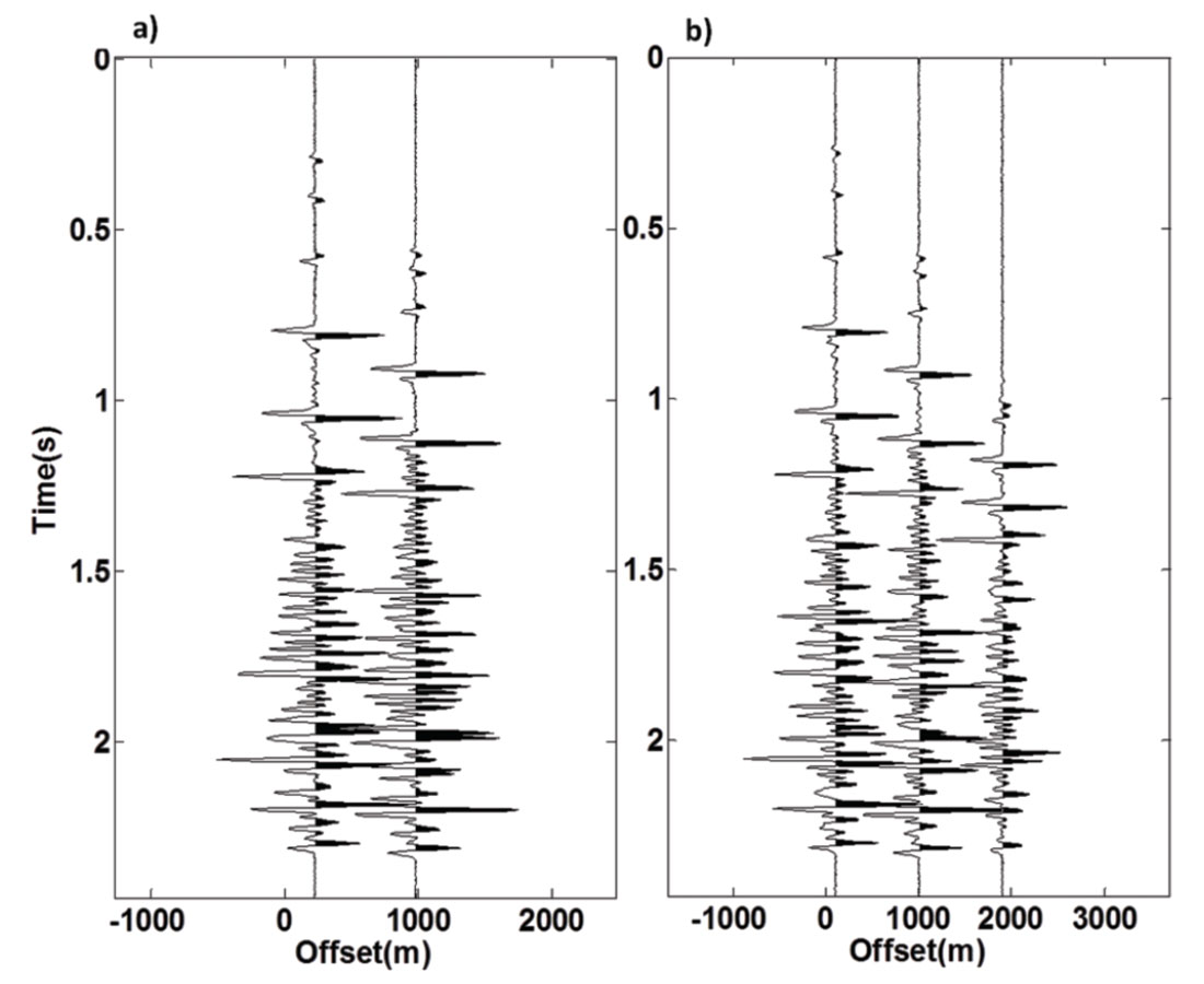 The data reconstruction ability of LSPSM facilitates prestack time lapse studies by generating comparable data for both baseline and monitor surveys. This is achievable by forward modeling of the separate LSPSM images of baseline and monitor surveys with a new geometry. Figure 10 shows the data from the baseline (a) and monitor (b) surveys for a CMP that is positioned at the middle of the seismic line. The comparison is not feasible since the traces have different offsets. Figure 11 shows the reconstructed data from the baseline (a) and monitor (b) surveys. Comparison between these two datasets becomes possible and Figure 11c shows the difference between the two datasets. LSPSM increases the reliability of time lapse studies by reducing the effects of different geometries of baseline and monitor surveys and reconstructing data which makes the prestack time lapse studies feasible. Joint LSPSM/inversion of time lapse data provides time lapse images which are high resolution and less affected by the different data acquisition geometries of the baseline and monitor surveys (Yousefzadeh and Bancroft, 2012c). Minimizing this cost function of a time lapse joint inversion is an expensive procedure since each iteration of LSCG is at least four times more expensive than one time conventional migration of same data. Solving this joint inversion cost function using LSCG requires more than 20 iterations. However, joint inversion is able to produce higher resolution time lapse images than the separate inversions of the same data.
