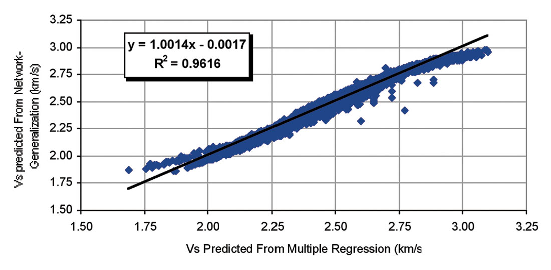 In the development of the Vs predictor, 35 samples of Vs were collected. These data were used for multiple regression to establish a model for Vs prediction and because we did not have enough data to train the network, some data sets that were created from multiple regression were used during the training stage, while the other sets were preserved to test the prediction ability of the model.