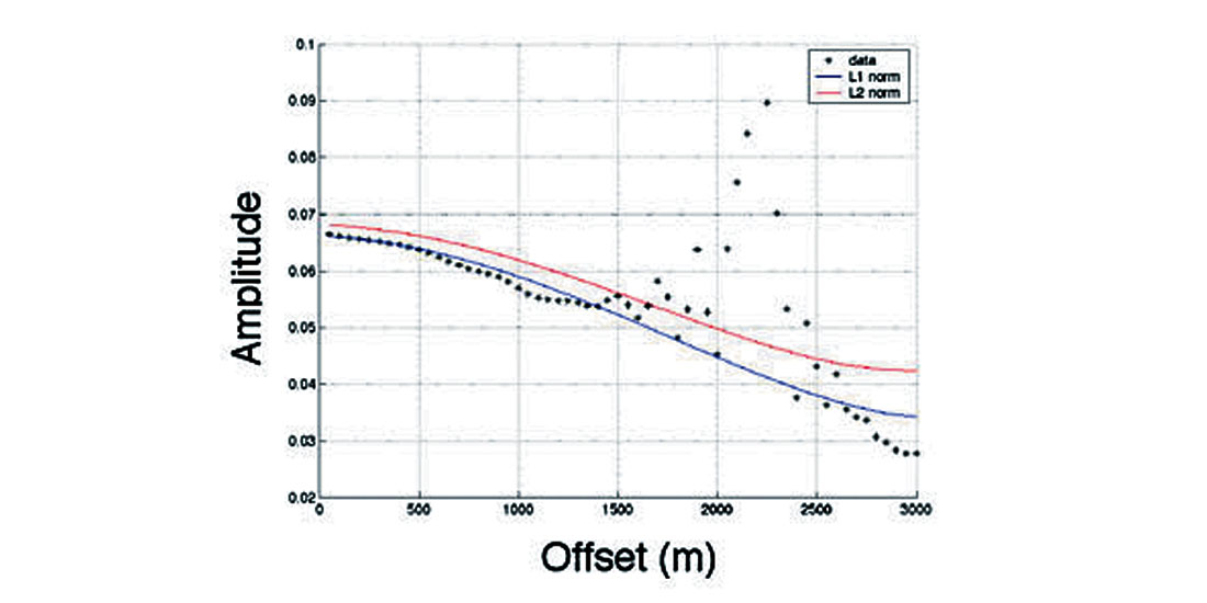 In the amplitude fitting, L2 norm is particular appropriate when the data contain random noise. L1 norm is considered robust when a small number of data points have deviant amplitudes, such as a multiple cutting across a primary reflection. To demonstrate L1 norm and L2 norm in AVO attribute extraction, a synthetic data set with strong coherent interfering noise was used and is shown in Figure 1. Fatti’s equation was used for amplitude fitting in this case. We can see that the L1 norm operation results in a better solution while the L2 norm solution is compromised by the spurious data points.