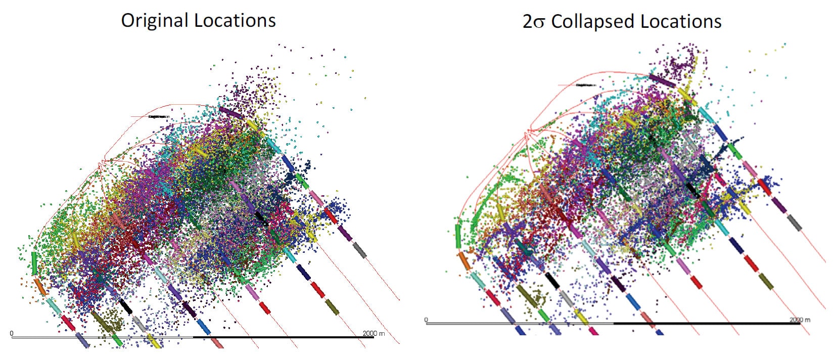 Along with improvements in data acquisition, many considerations in the processing workflow were addressed. A considerable amount of effort was put into reducing the uncertainty in event locations. The efforts included the research and analysis of attenuation, vertical resolution, boundary effects, and event cloud collapsing and clustering.