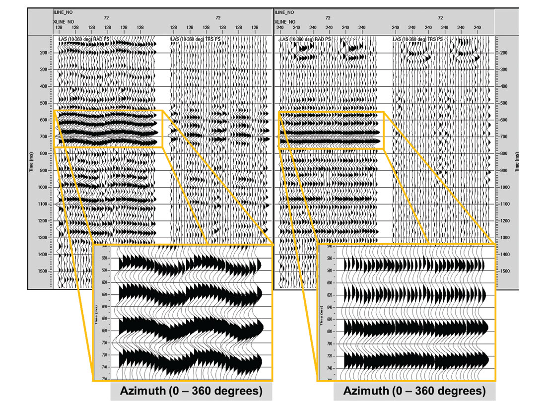Figure 7 illustrates RR/RT/TR/TT LAS stacks at location A before and after layer stripping. Events displaying sinusoidal traveltimes with azimuth on RR and TT LAS’s are flattened after layer stripping, while cross term energy is greatly reduced. Similar results apply to the analysis and layer stripping of the PS data at the same location (Figure 8).