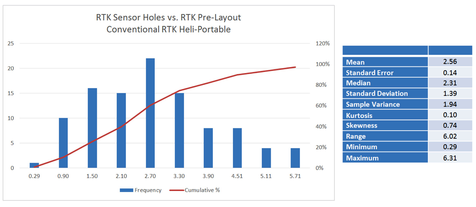 Figure 5 shows the statistical analysis for a conventional receiver deployment technique (ie RTK surveying of station stakes prior to the deployment of the receiver equipment) where the true locations of the receiver holes were re-surveyed by RTK after the receivers had been retrieved. The RTK re-survey showed mean differences of about 2.6 meters between the pre-deployment staked positions and the final, actual, receiver locations. This agrees with our statement above that “the quoted decimeter accuracy of the original staked location is very rarely indicative of the actual location of the receivers, which can easily be one, two, or even more, meters away from the stake.”
