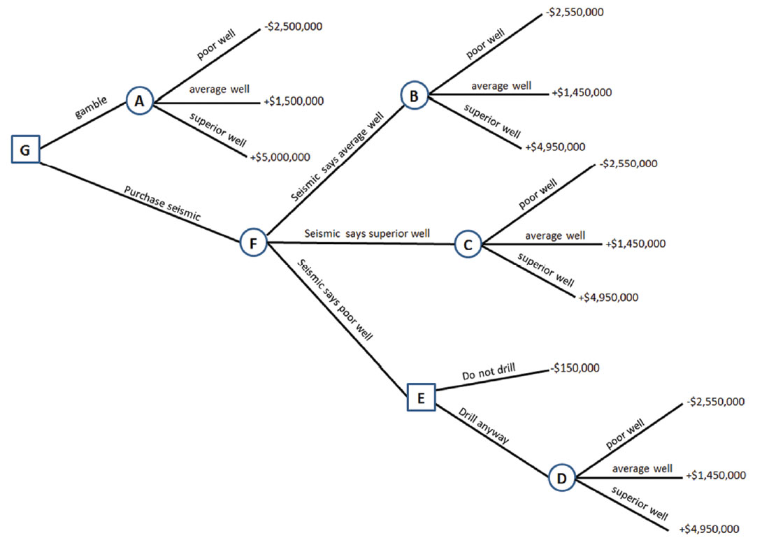 This means that the purchase seismic decision yields a much higher expected NPV (+$1,761,250) than the gamble strategy, and is thus the choice made at decision node G.