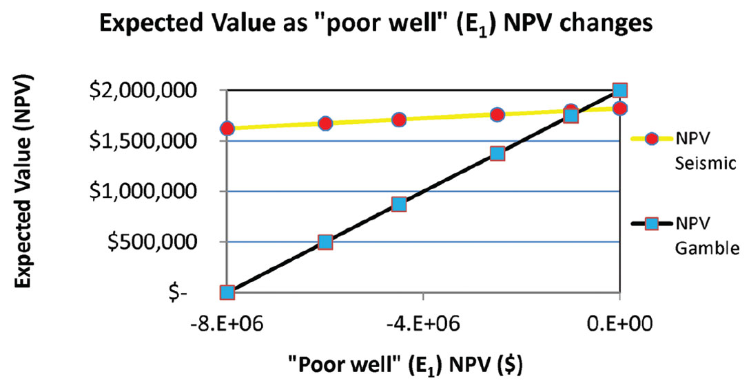 Specifically, we vary the expected value of the poor well or E1 event and observe the effect this has on the expected value of the seismic method. The variation in the poor well event goes from an NPV of $0 to -$8,000,000. This worst case scenario could primarily come about if the well had unusual operational difficulties (in either drilling or completion, or both) and was not productive.