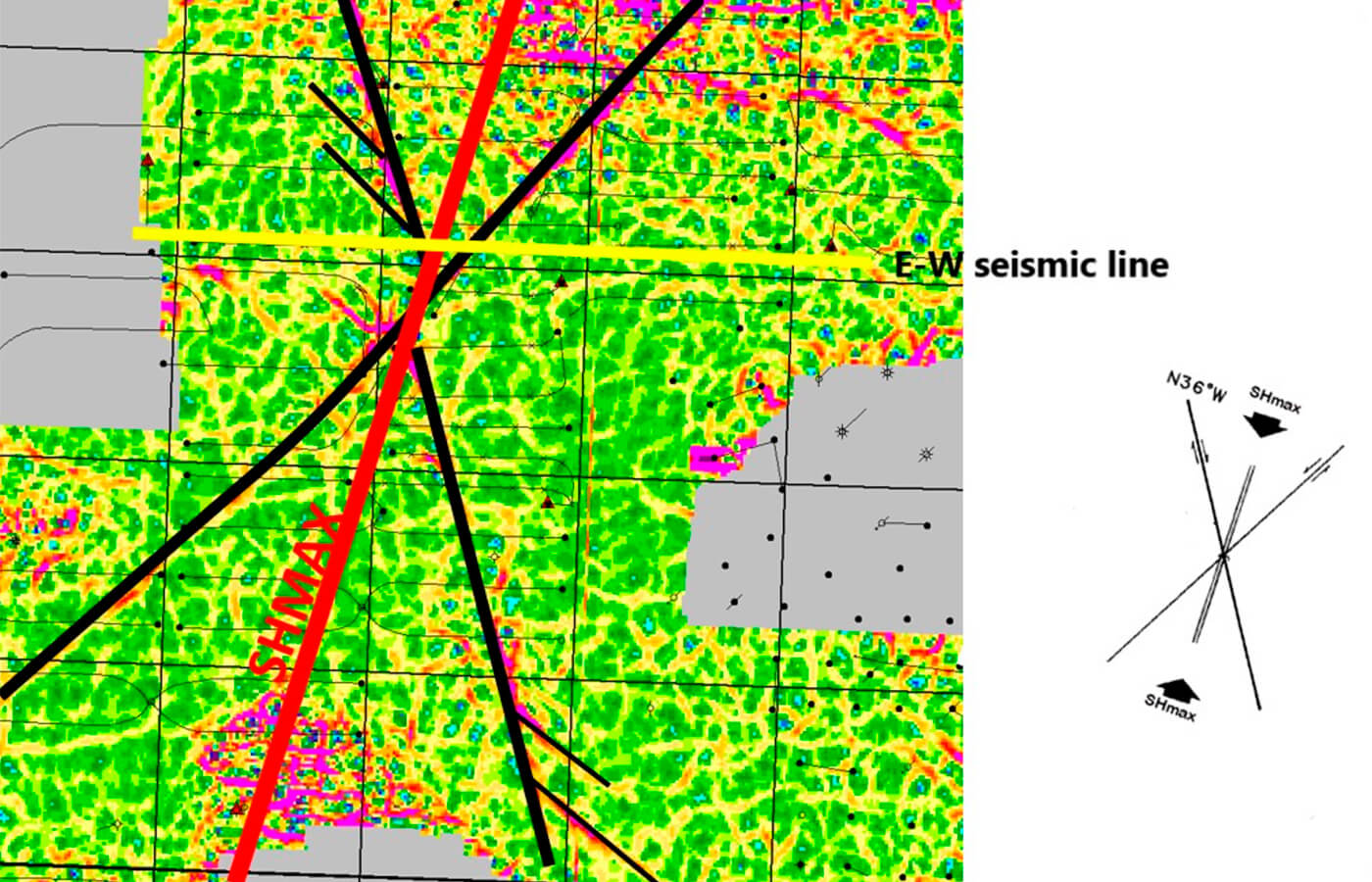 Our two strike-slip faults set up a pair of conjugate faults with the maximum stress direction (Lund Snee, J.E. and Zoback, M.D., 2019) defined as the angle bisecting the two faults as shown in Figure 11. The azimuth of SHmax as defined by the two strike-slip faults is 15 degrees east of north. There is no seismic evidence that these faults are present in the younger Cretaceous sediments, so the age of these faults is likely early Cretaceous/late Jurassic. The stress direction as derived from the conjugate fault system can then be thought of as a paleo-stress direction. Paleoreconstruction of Pangea has shown that since the Triassic/Jurassic time, Pangea has rotated about 15 degrees counter-clockwise (Torsvik et al., 2010), so that the azimuth of SHmax at the time of faulting was consistent with present day maximum stress direction of 30 degrees east of north. Additional support for the NE-SW lineament being a fault is provided by the strip logs of horizontal wells that crossed the fault.