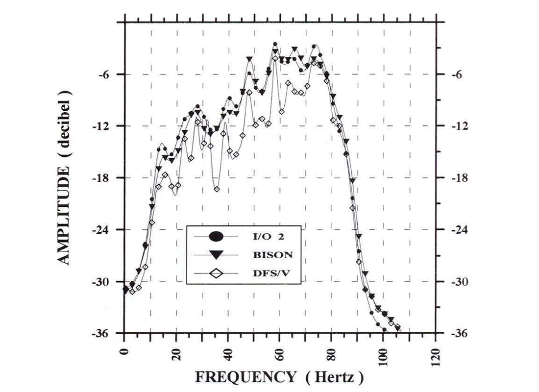 Post stack processing in the form of FIX migration followed by zero phase deconvolution (spectral whitening) were used to see how each data set would respond to a final boost of the frequency bandwidth. The greatest improvements were noticed for both 24 bit data sets. Figure 5 shows a portion of the boosted data stack from the Bison data set over the channel anomaly. The narrow band filter panels give an indication that signal to noise ratio is good over the entire frequency bandwidth. The filter panels for the I/O system show similar good results. The DFS/v data set did not respond as well to post stack processing as did the other two data sets.