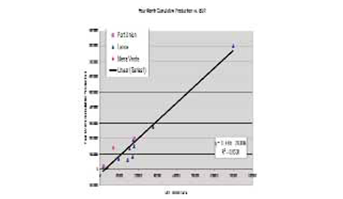 SUREFrac is used by first identifying a fracture indicator (FI) and then ranking the variety of inputs that the geoscientists and engineers familiar with the field suggest may have influence on it. For the Pinedale Anticline Field, four-month cumulative production is chosen as the fracture indicator. This is the best indicator of fractures in this field due to the paucity of good well information on the fractures and limited production from the recent, better wells. The field has very few long-term producers since the aforementioned new completion techniques, and the clearance of some environmental issues, have only recently revitalized it. The FI correlates well to Expected Ultimate Recoverable (EUR,) a measure that is often used as a fracture indicator (Figure 9). The AVAZ and other seismic attributes were used as inputs to SUREFrac’s ranking process along with geologic models of porosity, net-to-gross, and coal and the structural interpretation. The geologic information was derived from the analysis and interpretation of wells available in the public domain and from the Veritas Pinedale 3D seismic survey. The rankings of the most important of the inputs to SUREFrac in predicting the FI are shown in Figure 10. The crack density (AVAZ amplitude) and its envelope are the most important attributes in these rankings; more important than the next attributes, the semblances, which are commonly used for fracture detection.