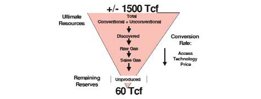 Canada’s current, known, accessible natural gas reserves are approximately 60Tcf; with production at over 6Tcf per year, this is less than a ten-year supply. The challenge for the future is how quickly and economically Canada’s gas resources can be converted to producible reserves. (Figure 2).