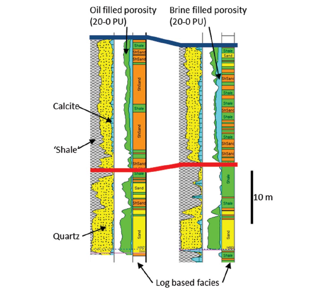To prepare the available log data, detailed petrophysical analyses were completed on all wells within the field. Core data from three wells were used to calibrate the petrophysical processing and constrain the bounds of porosity and relative mineralogical abundance estimates. Reservoir quality sands typically comprise over 90% relatively well sorted quartz sand, with porosities that range from 8-18%. The processed log data were used to create a relatively simple facies log, based on porosity and lithology, comprising sand, shaley-sand and shale; where only the latter is considered non-reservoir (Figure 3).