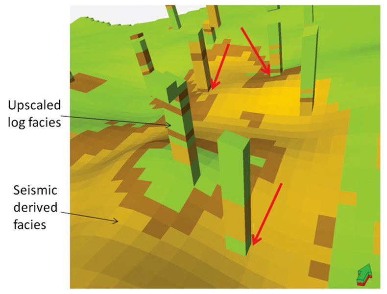 Given the qualitative positive correlation between seismic amplitudes and acoustic impedance, inversion and seismic amplitude data were used to define geobodies representative of lithology within the reservoir. These geobodies were upscaled to the geocellular model, creating a ‘geoseismic’ model of the reservoir. The relatively coarse lithological units defined in the geoseismic model were further refined using the upscaled facies logs based on well data. It is clearly necessary that a consistent facies or geological model is defined, and any misfit in lithological prediction between well log and seismic geobody definition must be reconciled. As the log data are considered hard data, the geoseismic model was manually adjusted to honour the well log based facies and thus construct a fully populated geological or facies model.