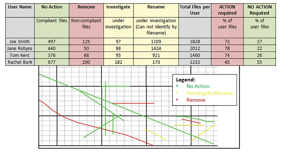 The geographical representation pictured above represents the data the corporation can use, the data it cannot use and which data is still under investigation. The color coded report identifies each user, the total number of files in question, and the magnitude of risk to the corporation should data be used without entitlement.