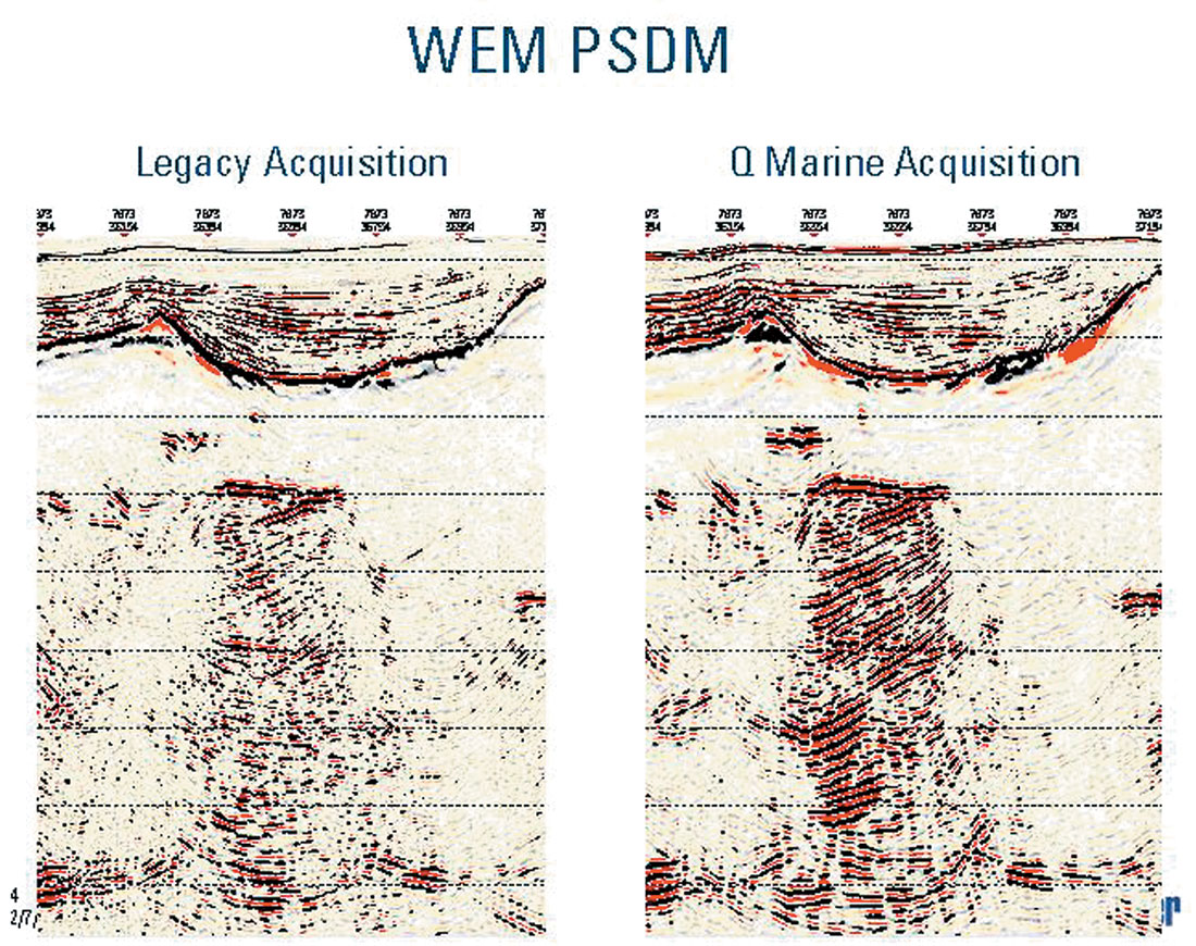 Nevertheless, continued investment by the service companies is yielding better technology. Consider Figure 4 which compares new acquisition targeted at subsalt reflectors with that from just a few years ago. Such clear images of the base of salt and subsalt reflectors are invaluable in mapping and drilling subsalt plays. In general, as we search to develop more difficult prospects and provide more reservoir information, we will likely see a resurgence of acquisition technology wherein acquisition plans and systems are designed to acquire the data needed to solve these specific problems.