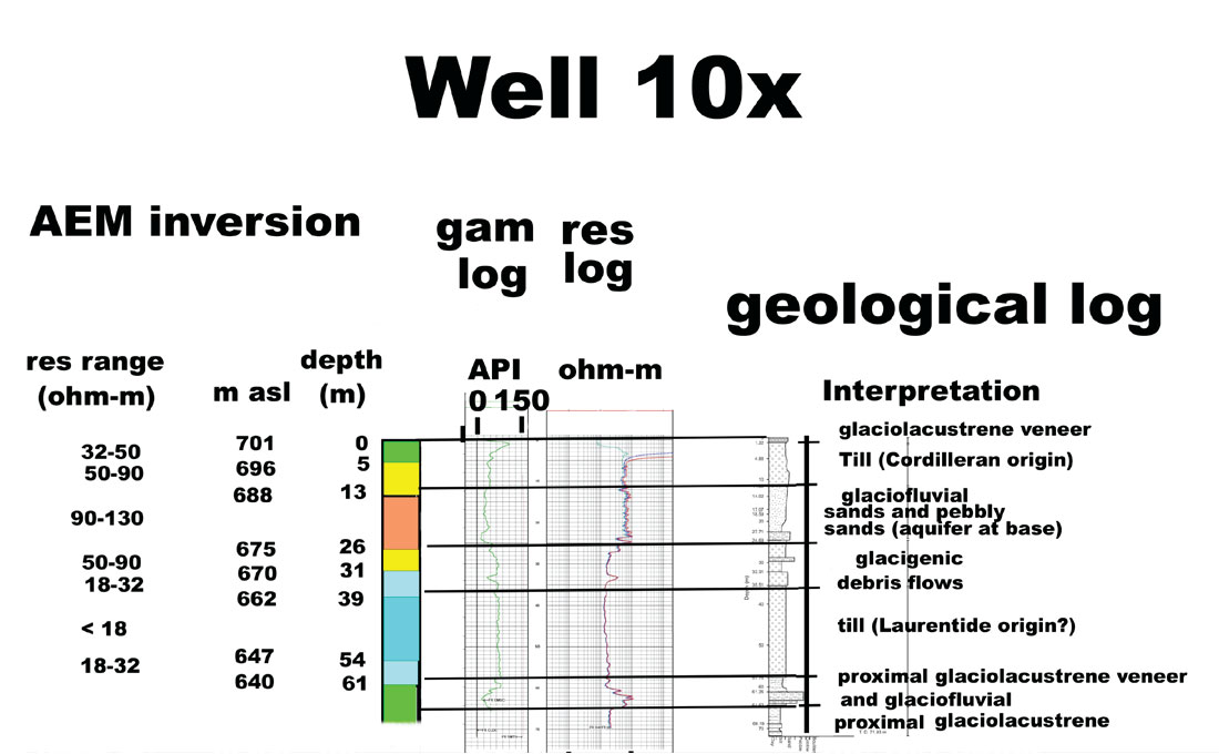 For this paper, the Aarhus AEM inversions for wells 10b and 10x were selected for comparison with the geological log compiled by Quaternary Geosciences Inc., and the resistivity and gamma logs run by Weatherford.