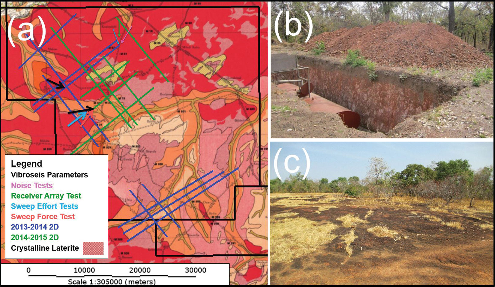 Poor data areas in Southern Chad were observed to be associated with laterite occurrence, as mapped on vintage soil maps. Where possible, new seismic lines were placed to avoid surface occurrences of crystalline laterite. Based on the test results acquired during the 2013-2014 seismic acquisition program, two different sets of parameters were recommended for acquiring 2D data during 2014-2015 seismic acquisition. In areas with difficult near surface conditions, such as Region 1, (surface laterites, near surface scatters), high effort acquisition with areal receiver arrays, smaller spatial sampling interval, and multiple sweeps were recommended. In areas with good data quality, such as Region 2, efficient linear receiver arrays, a larger spatial sampling interval, and single sweep were used.