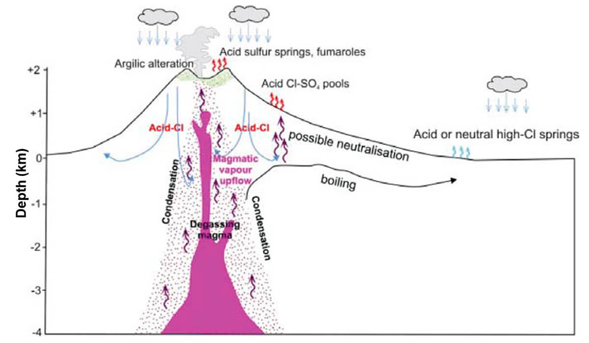 Commonly, there are three kinds of surface manifestations associated with high-temperature geothermal systems related to magmatic plays. Directly over the heat source acid sulfur springs and fumaroles with high gas content are generally observed, while over the upflow zone there will be acid sulphate fumaroles and Cl-SO4 pools. Further out in the outflow zone, where the fluid has depressurized and degassed, chloride springs with low gas content are more common.