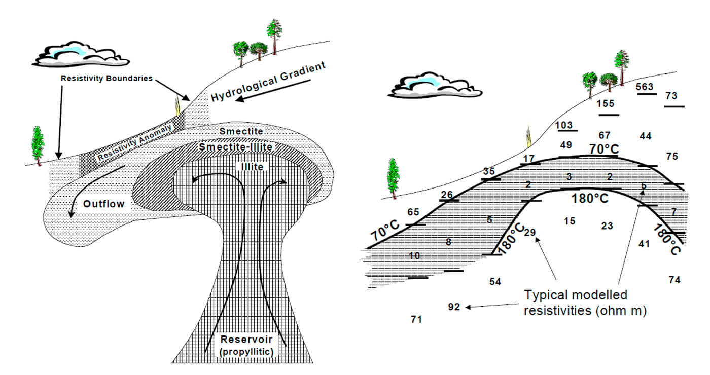 Hydrothermal systems located close to volcanoes – active or extinct – or over areas of high thermal gradient form convective cells of fluid circulation that over time form an altered clay layer, with low electrical resistivity property, that acts as a cap rock layer over the geothermal reservoir. The components of these high-temperature geothermal systems: the heat source, the cap rock layer, structures that can control fluid flow, and the high-temperature fluid in a rock matrix, all produce resistivity signatures that can be captured and identified by magnetotelluric surveys.