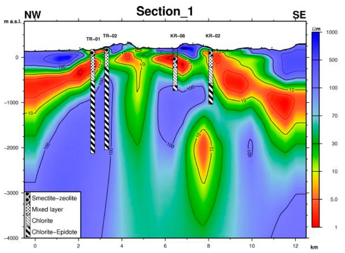 Figure 9 shows an example of a 3D MT model over a cross section of the Krýsuvík high-temperature geothermal area in Iceland (Hersir et al, 2013). The clay cap layer appears as low resistivity values of less than 10 Ω-m, while the underlying propylitic reservoir appears with somewhat higher resistivity values of around 100 Ω-m. The high resistivity near the surface corresponds to unaltered rock. Also, the MT resistivity model displays a close correlation with the borehole information.