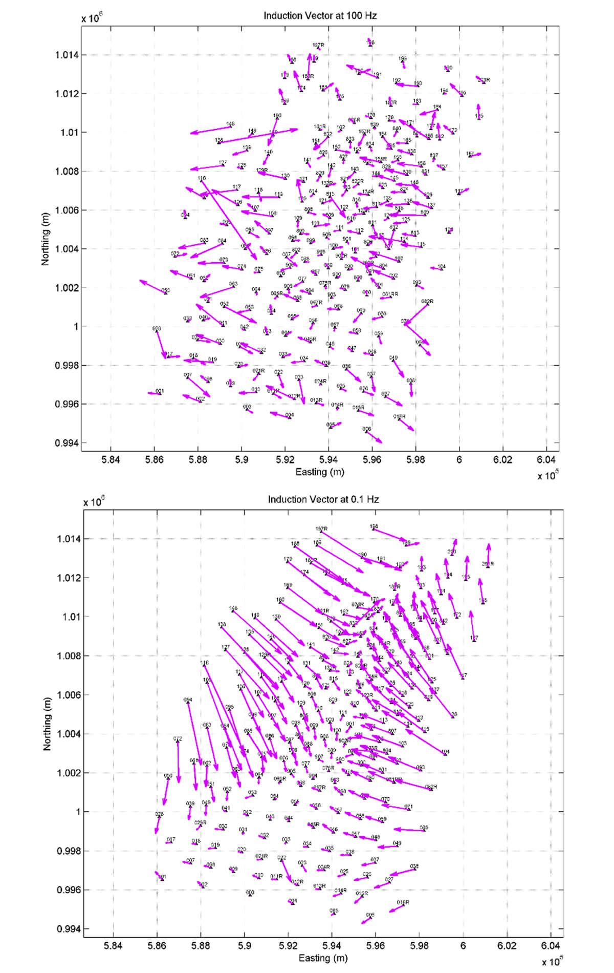 The low-resistivity zones can also be qualitatively investigated using the so-called induction vector, which is calculated using tipper components of the MT data. The tipper is the transfer function (i.e., ratio) between vertical and horizontal magnetic field at each MT site. A derivative of the tipper data, induction vectors are presented as arrows that point towards the conductor, and therefore, are diagnostic of conductive zones in the subsurface. The plot of the induction vector at 100Hz in the Fantale survey area does not show a clear alignment, indicating that there is no uniform conductive zone at the skin depth corresponding to that frequency (Figure 11). Skin depth is a measure of depth of investigation of MT data at a given frequency. The plot of the induction vectors at 0.1Hz, however, does clearly identify a zone of elevated conductivity, which may correspond to a clay cap layer.