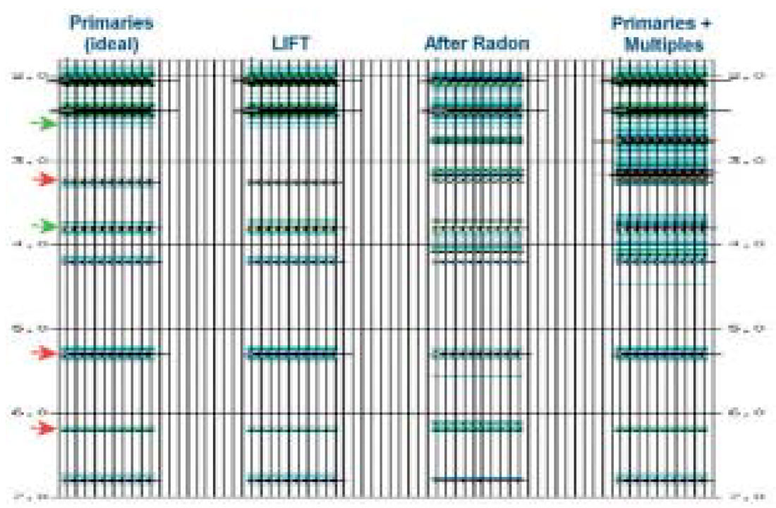 The LIFT technique then effectively removes residual multiple energy that Radon could not attenuate, most notably multiple energy at near offsets. Further, there is very little primary energy leakage (Figure 8).