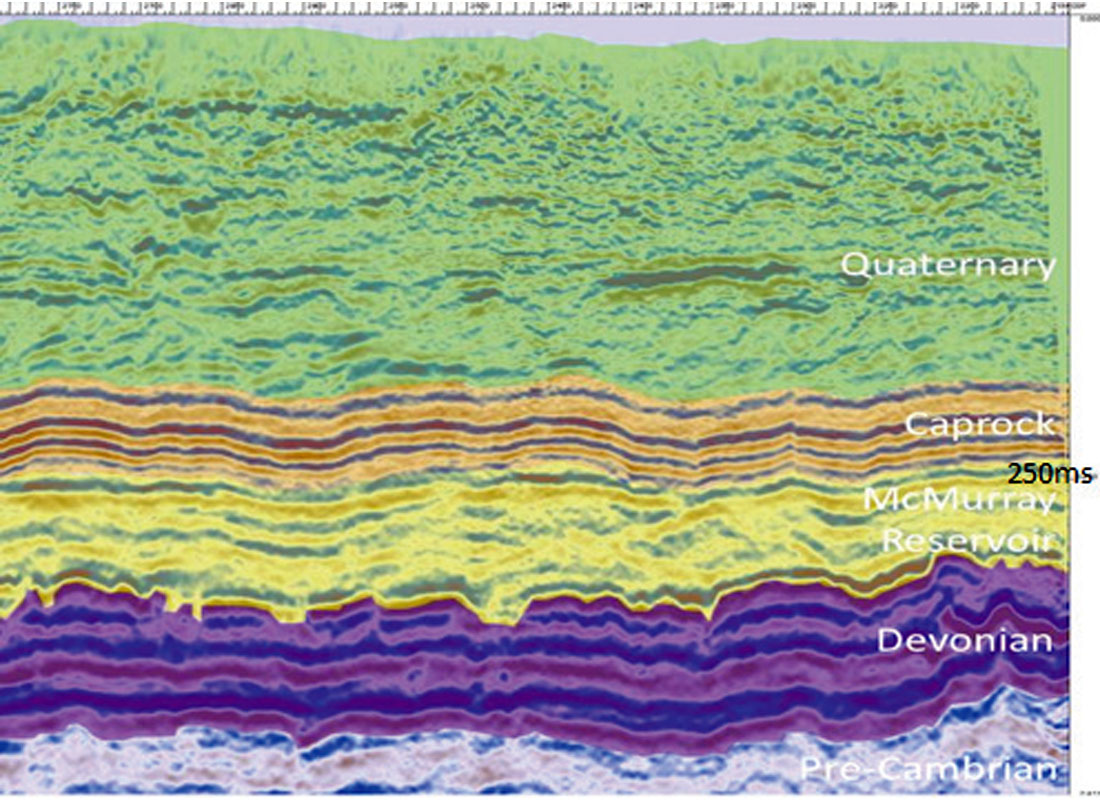 Below the caprock, the notoriously complex McMurray reservoir is made of inter-braided channel systems and inclined heterolithic stratification (IHS) that vary from clean sand beds to silty muds. At the base of the reservoir, there is a major unconformity that spans more than 200 million years, resulting in an extremely rough and weathered surface with paleo-topographic highs and lows. The Devonian formation is highly faulted, karsted and the paleo-surface is riddled with sink holes (Altosaar 2013). Some of the faults in the Devonian have clearly controlled the sedimentation of the McMurray reservoir. The Devonian section lies unconformably on the Precambrian basement. The contact between these two formations is another very rugged and weathered unconformity. Numerous fault-bound rhomboidal blocks can be identified at the top of the Precambrian.