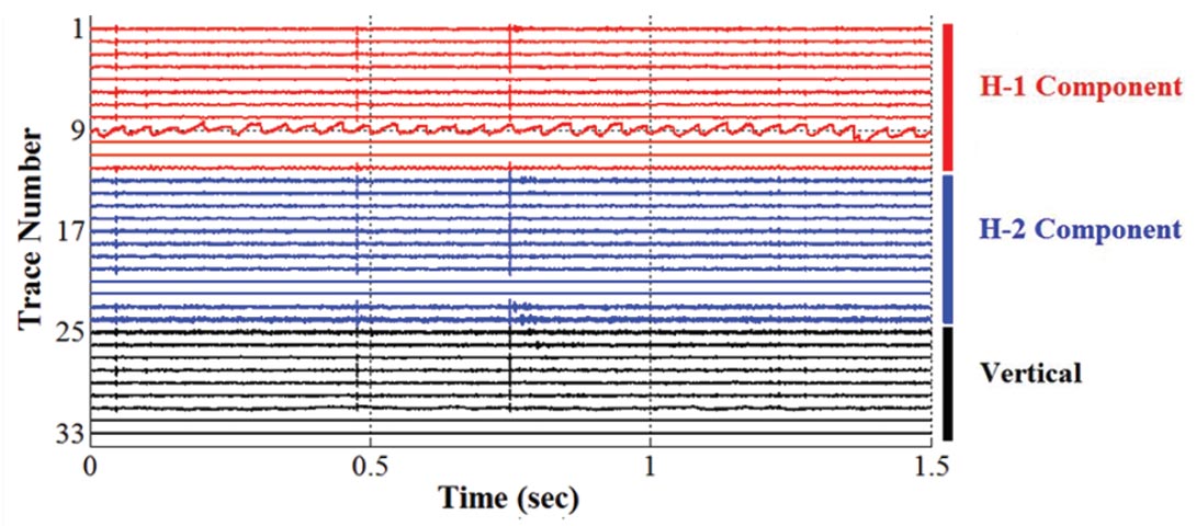 Figure 6 is a 1.5 sec. window from a hydraulic fracture that was performed in northeast British Columbia in the winter of 2010. Electrical noise is recorded numerous times on all channels except trace 9, which is the deepest H-1 geophone. It appears that this geophone may be poorly clamped and vibrating against the casing at about 28 Hz. This noise was observed in six minutes of data.