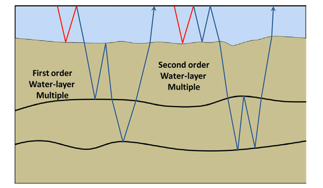 Figure 1 illustrates two different types of free-surface multiple. On the left is a water-layer multiple which is defined to be one which has at least one upwards bounce at the water bottom and one downward bounce at the surface. It is a special case of the more general free-surface multiple, which may or may not include an upward bounce at the water bottom. SRME addresses both of these types of multiples, but with limitations as outlined above. MWD on the other hand only seeks to attack the water-layer multiples and defers the remaining free-surface multiples for subsequent attenuation by an SRME type approach.