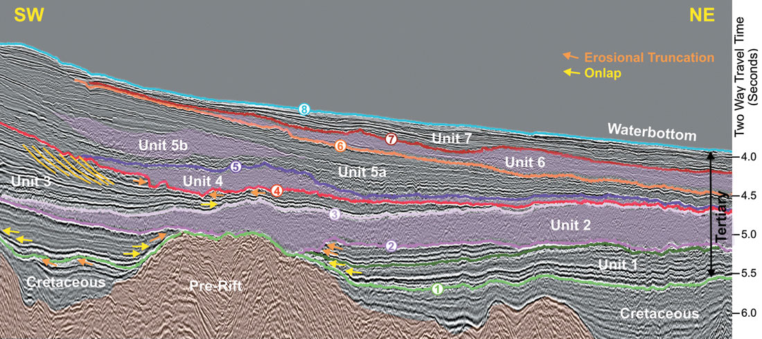 Eight seismic horizons, including the seabed, the widespread Base Tertiary Unconformity and a number of intra-Tertiary unconformities are interpreted throughout the 2D seismic grid. These horizons divide the Cenozoic succession into seven major seismic-stratigraphic units. Three of the mapped units (Units 2, 4 and 6) exhibit a chaotic low- amplitude internal acoustic character, and external shapes that are consistent with mass transport deposits. Mass transport deposits (MTD’s) are generally deepwater features that form through the mobilization or downslope movement of sedimentary strata and the re-deposition of the transported material (e.g., mass flows, debris flows, turbidites, submarine slumps and/or slides). MTD’s exhibit a seismic facies that is characterized by mounded external forms and hummocky to parallel low to moderate amplitude internal reflections that show poor continuity (Walker, 1992). In seismic profiles from this study, the interpreted MTD’s show local evidence of amalgamation of the deposits created by more than one failure event and/or possible fluid-escape structures at the top. One MTD appears to incorporate a displaced block at its base. The remaining seismic units consist mainly of alternating high- and low-amplitude parallel reflections.