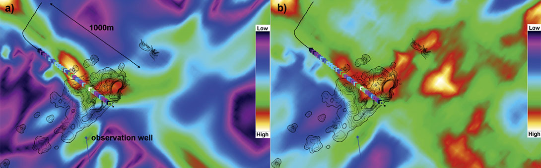 The mu rho attribute shows an obvious step change at the Viking level (the upper horizon) and at the Nordegg level (the lower horizon). The low-rigidity Poker Chip shale overlies the Nordegg, and exhibits a strong contrast to the rigid, chert dominated Nordegg. These variations are remarkable, and suggest rock property variations will likely be an important causal variable in the distribution of fractures.