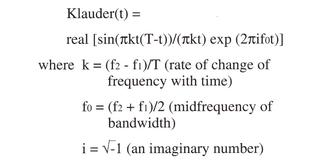 Like Ricker and Ormsby wavelets, a Klauder wavelet (fig 5) is symmetrical about a vertical line through its central peak at time zero. A Klauder wavelet represents the autocorrelation of a linearly swept frequency- modulated sinusoidal signal used in Vibroseis. It is defined by its terminal low frequency, "f1"; its terminal high frequency, "f2"; and the duration of the input signal "Τ", often 6 or 7 seconds. The real part of the following formula will generate a Klauder wavelet: