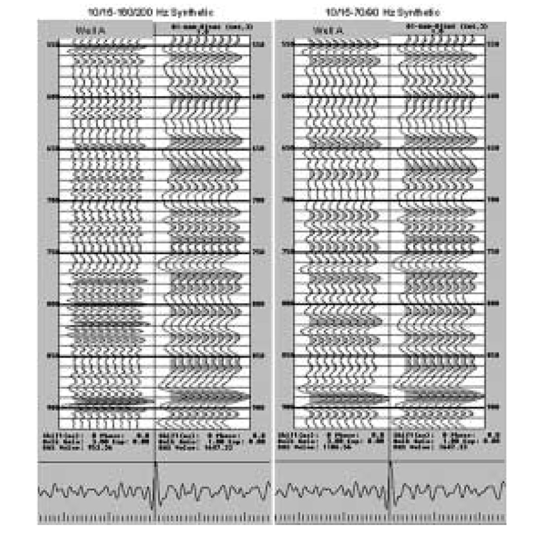 I sent over a 2-D seismic line that had three wells drilled into it, two of them this year with a full suite of logs. This dataset was also band limited Vibroseis data, with a high frequency cutoff of 96 Hz. This line had been conventionally processed by several different processors, so its bandwidth and signal to noise characteristics were well known. Within a few weeks, I received the result from company X. The data that I got appeared to be very high in frequency content and very continuous. X’s representative showed me filter panels that he argued proved that I had spatially continuous frequency information beyond 160 Hz, and perhaps as high as 200 Hz.
