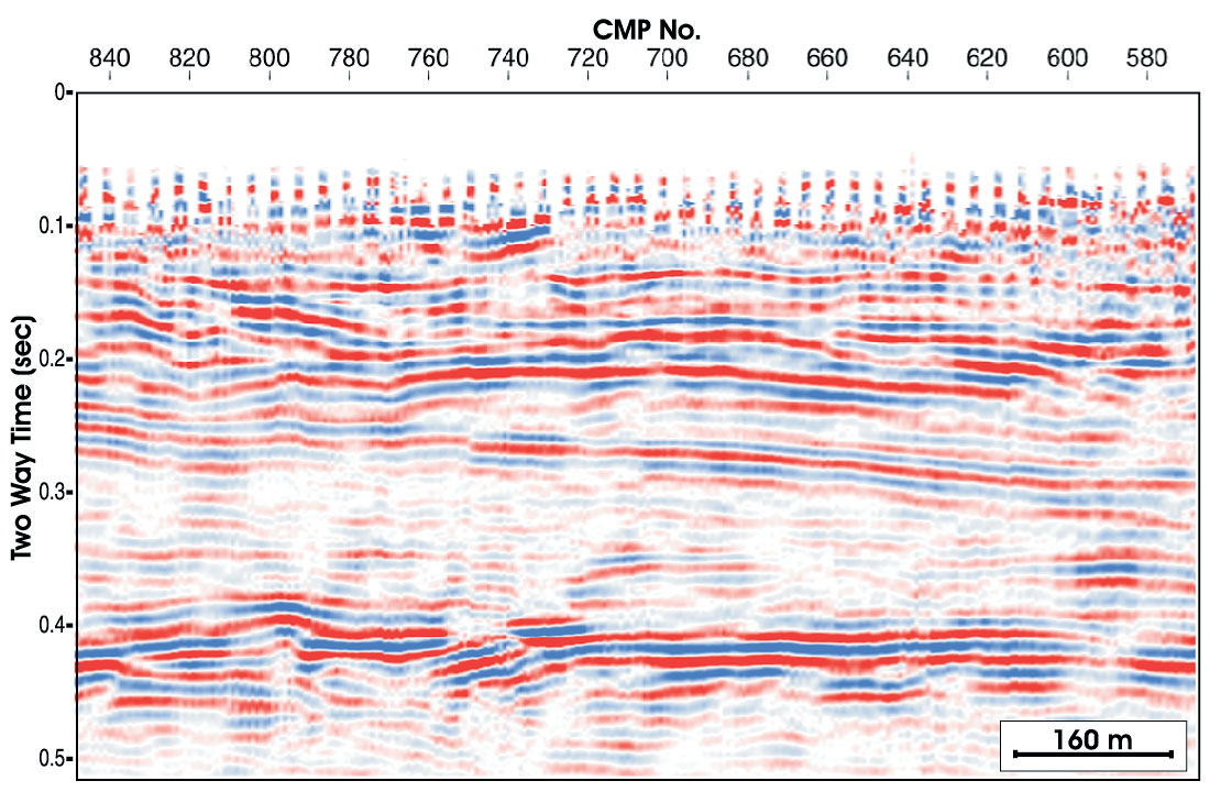 High spatial resolution was maintained by using geophone singles at a 4-m station spacing. Shot spacing of 24-m (6 stations) was a compromise between the maximum number of shots (up to 150) that could be carried out in during daylight hours and the desire to maximize mid-point fold. An average fold of 40 was obtained for the survey.
