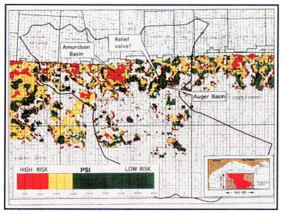 Figure 9 shows an application of this procedure, taken from Dutta (1997) from the deepwater, Gulf of Mexico. The area of study is shown in the inset. Here a 3-D model of effective stress has been developed over a prospective play fairway. The model covers an area of 140x102 km, with water depth greater than 330 m. Figure 9 is a map of the effective stress, in psi, and projected at a prospective horizon over many blocks. The color codes in this figure represent the risk associated with hydraulic seal failure; red denotes high probability of seal failure. This sort of maps has helped the explorationists to high-grade the areas of low top seal risk, and downgrade risky areas.