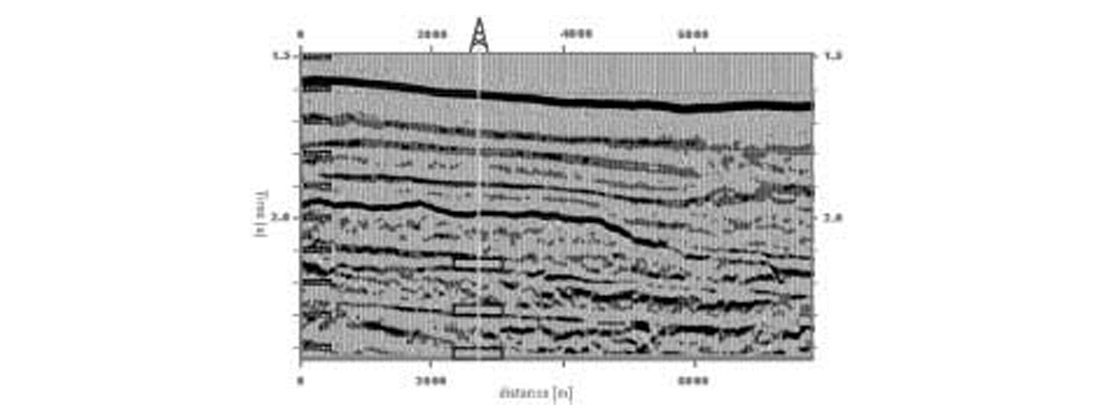 For tests on real data, we selected a 3D seismic data volume from the Gulf of Mexico (Mississippi Canyon area, offshore Louisiana). In this area, the SWF conditions are known to occur. The seismic data was reprocessed at 2ms sampling interval for high-resolution trace inversion. The key acquisition parameters are: source at 7m depth, streamer at 10m depth, 80m shot interval, 4800m streamer length and 30 fold multiplicity. The data was processed in a 2D sense because the binned data exhibited abrupt amplitude changes versus offset not related to geology but rather to contributions from different source to streamer combinations. The geometry related offset changes manifested themselves as the amplitude and reflection time discontinuities. A 2D stacked section, reprocessed at 2 ms is shown in Figure 26. The well is indicated with markers at the three SWF levels. As input to prestack inversion, the data were corrected for divergence, but not for absorption, and zero-phased without further deconvolution. In spite of a strong P-wave contrast, on a stacked section the reflection strength of the SWF sands is weak, often making them less visible than other sands. This is due to the Type II AVO behavior, leading to a polarity reversal around 30 degrees in this particular case. The results of prestack inversion are shown in Fig. 27; the figure on the left shows the angle gather at the well location, and the one on the right shows the results from GA inversion. Figure 28 shows the synthetic Vp/Vs log obtained from the prestack inversion. Note the high values of this attribute at the SWF locations.