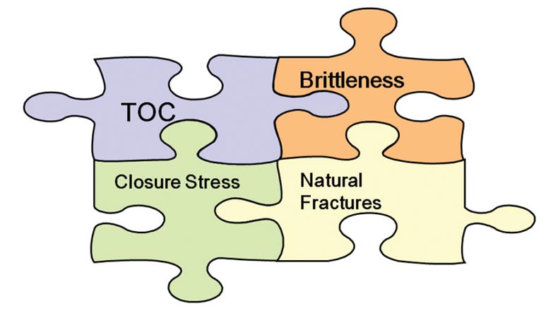 Although shale reservoirs have been producing oil and gas since the beginning of the 19th century, it is only recently that new technologies allowed for wide-spread development of these resources. Horizontal drilling combined with new fracking technologies allowed small US companies to prove the feasibility of recovering economical quantities of hydrocarbons locked in shale reservoirs, which previously were regarded as boring or as an annoying source rock. Looking back, the success of a given shale well was not solely dependent on a frack job and the industry soon discovered that a shale reservoir could be even more complex than a conventional reservoir. With most of the wells costing between 4 and 12 million dollars (mostly spent on completion), the drilling of an uneconomical shale well starts to hurt the bottom line. Efforts are underway to eliminate uneconomical wells in today’s fast-paced development programs. After a decade of rapid development within various shale plays, we are now able to identify several key reservoir properties that can have a major impact on the performance of a shale well. Although each shale play is unique, there are some general rules that are more widely applicable than others. These rules are derived from the following observations, which we might describe as the “ideal shale well”: 1) A well must be drilled in a zone that has a high TOC content thus guaranteeing the presence of oil or gas (assuming a favorable petroleum system), 2) The intercepted “shale” must be brittle enough to be fracked, 3) The induced fractures resulting from the frack job must intercept a natural fracture system and porosity, and 4) The induced fractures must remain open for a sufficient period of time to allow economic volumes of hydrocarbons to be produced. We define four key reservoir properties in an effort to simplify field development.