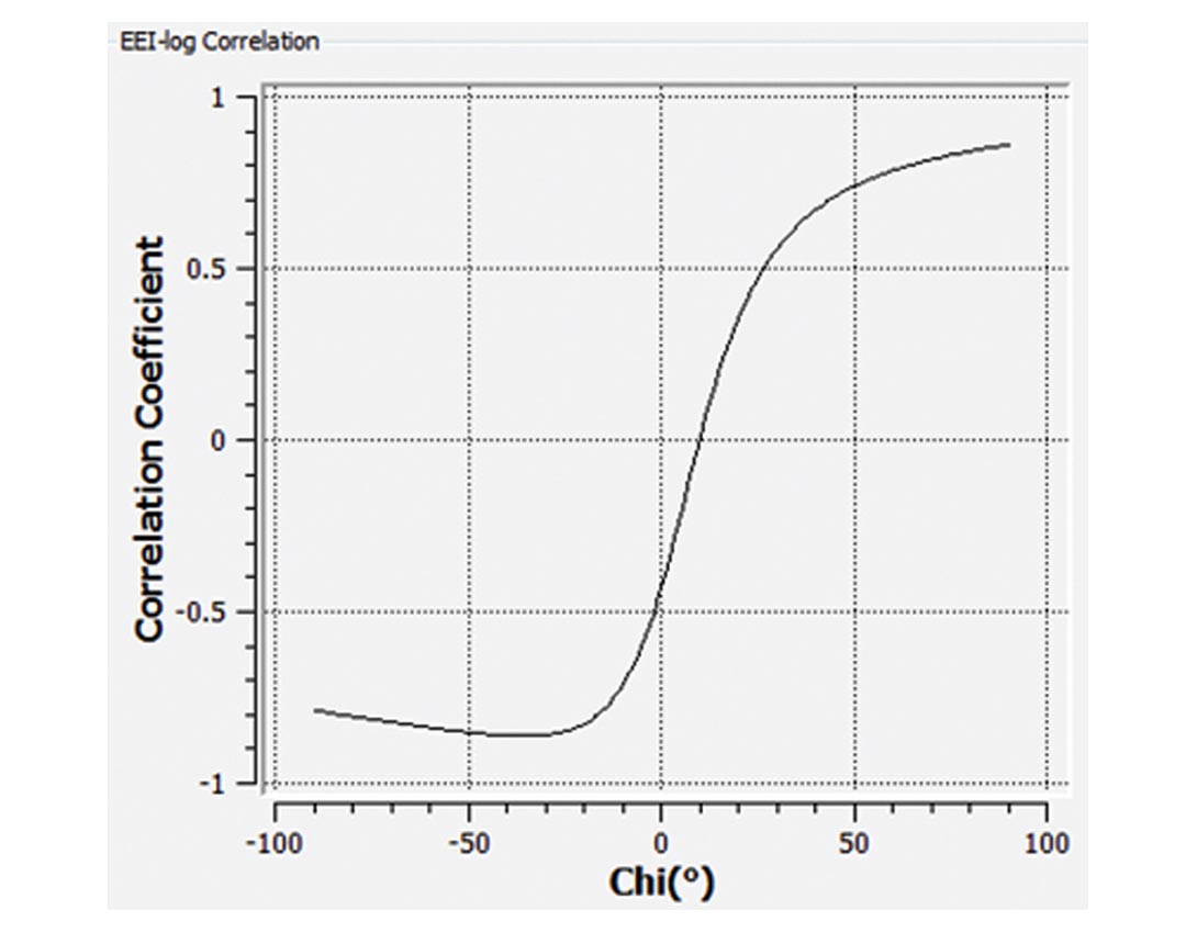 The other powerful feature of the EEI comes from the use of the χ angle. The main difference between extended elastic impedance and normalized elastic impedance (Whitcombe, 2002) is the change of variable from sin(θ) to tan(χ). This change of variable allows for calculation of impedance values beyond physicallyrealizable angles. As shown by Whitcombe et al. (2002), certain values of χ produce extended elastic impedance that correlates well with rock properties, such as lambda, mu, bulk modulus, and Vs/Vp ratio. Additionally, one may determine empirically a χ angle that correlates well with other log curves, such as gamma ray, porosity, or water saturation (Whitcombe et al., 2002). Once the compressional velocity, shear velocity, and density cubes are computed from the extended elastic impedance, other “rock property” cubes can be calculated using the appropriate value of χ. Since we noticed that key reservoir properties such as TOC could be inferred from other logs such as gamma ray in the case of the Marcellus shale, the EEI provides the unique opportunity to invert directly for gamma ray thus providing a seismic estimate of TOC. For example in the Niobrara reservoir at Teapot Dome, the porosity is correlated to the χ angle as shown in Figure 7. This correlation is the highest when χ is equal to -30 degrees. Using this value in the EEI results will lead to the direct inversion of porosity (Figure 8) at a very high resolution since all the EEI results are derived from the stochastic inversion sampled at 1 ms or less. Based on various projects using the EEI we have successfully found high correlations between the χ angle and gamma ray, porosity, resistivity, water saturation and other reservoir properties.