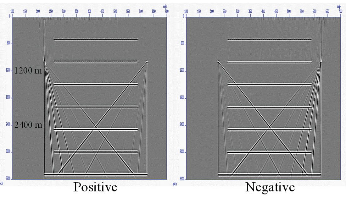As expected, in these cases PSDM behaves much better and can accurately position and focus the data. Figure 7 shows the stack results for both positive and negative offsets after PSDM. In this case the anisotropy was larger and traveltimes were computed by an exact and efficient ray method. Also, the point diffractors were replaced with more extensive flat reflectors for the purpose of velocity model building. This provided a means for construction of velocities for PSTM and to help constrain the anisotropy for PSDM. Note the different illumination of dipping events for positive and negative offsets, a characteristic of imaging with asymmetric PS-waves.