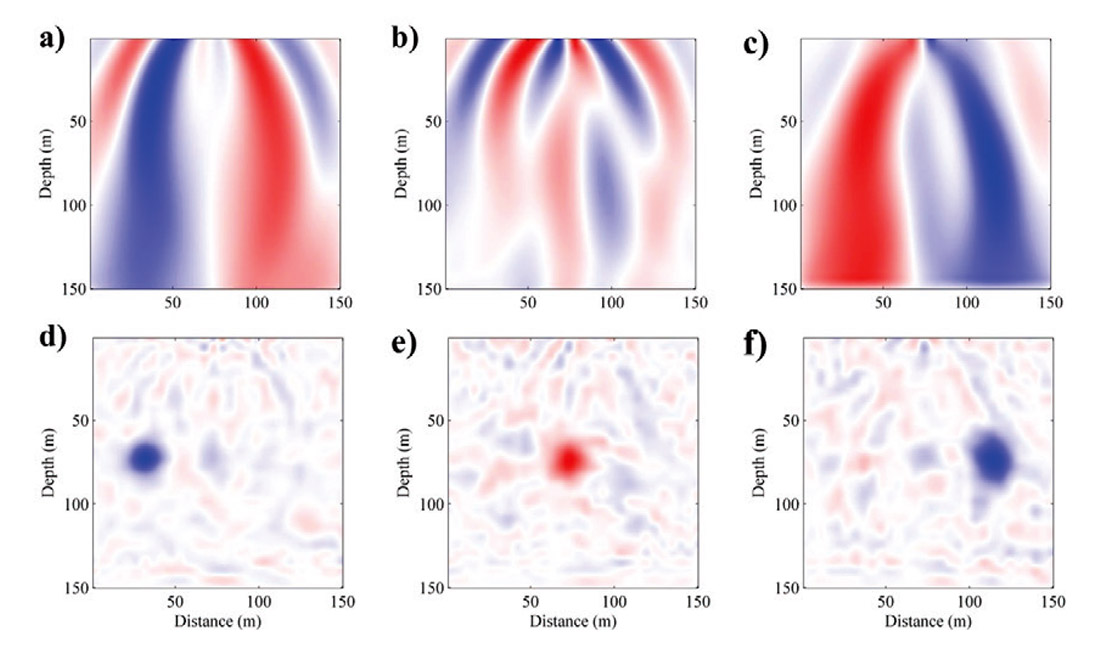 In this section, we present numerical examples to show that the multi-parameter Gauss-Newton Hessian can suppress parameter cross-talk in multi-parameter FWI. We describe the isotropic and elastic media using three parameters: using three parameters: P-wave impedance IP, S-wave impendance IS and density ρ. Figures 6a, 6b and 6c show the true model perturbations of IP, IS and ρ with three Gaussian anomalies. One source is arranged at the top surface and thirty receivers are distributed at the bottom of the model.