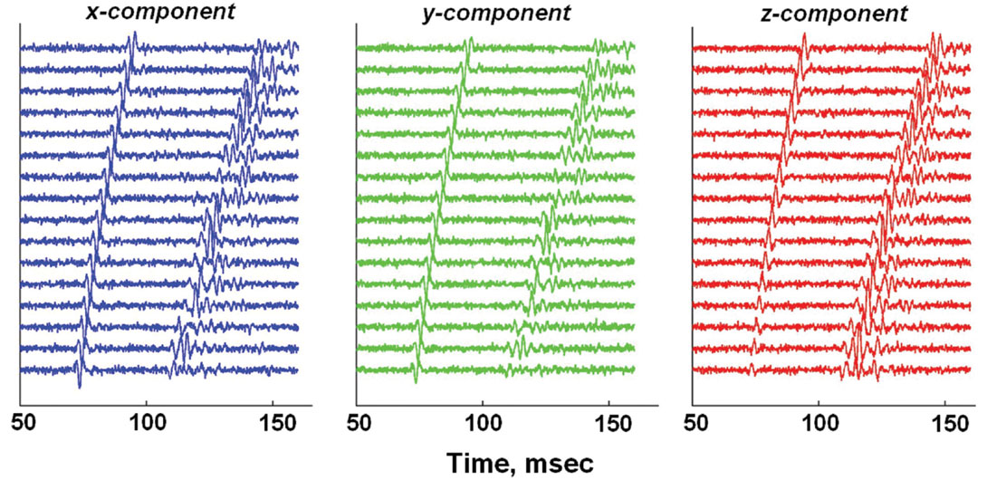 Figure 5 shows gathers of 3C seismograms for the source location and geophone positions for well W-3 on Figure 2. The seismograms have been plotted as color-coded triplets for each receiver, with blue-green-red denoting the x-y-z components, respectively. The amplitudes of the P arrivals have been set to 0.5 times the amplitudes of the S arrivals. The head wave amplitudes have been arbitrarily set to 0.25 times the direct arrival amplitudes. The SNR values are set relative to the direct P wave amplitudes. The low-noise traces have SNR = 10 (Figure 5a), while the noisy traces have SNR = 3 (Figure 5b). The higher noise levels on Figure 5b completely obscure the weak head wave P arrivals.