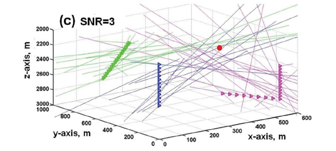 Figure 11 is a 3D view of 44 receivers in a homogeneous velocity structure. The receivers are situated in a vertical well, a slanted well, and a well with a horizontal leg. From each receiver is a straight raypath back-projecting along propagation directions estimated from the three component P-arrival amplitudes. When P-arrival amplitudes have high SNRs, the back-projected straight lines in 3D all intersect at the hypocenter location (Figure 11a). When there is moderate random noise in the microseismograms, the back-projected vectors do not intersect at a common point, but they converge towards a volume surrounding the microseismic source (Figure 11b). When the random noise is more extreme, there appears to be neither rhyme nor reason in the pattern of the back-projected vectors (Figure 11c). However, by applying the noise-signal separation (NSS) scheme developed by Han (2010), random noise in the P wave arrivals can be reduced before calculating the direction cosines. After noise reduction on the 3C amplitudes, the scatter in the estimated propagation directions is much reduced, to the point that a statistically-based clustering method gives usable estimates for the hypocenter coordinates.