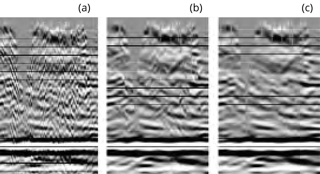 The shallow parts of seismic sections often contain many kinds of noises. Besides the random noise, coherent noises such as residual ground- roll, refraction energy and even acquisition footprint, are often present at the top of the seismic sections. The computation of event expanding rections can be noise sensitive, caution is needed when more than one direction present at same locations. The following example shows one way to overcome such contradictions. To reduce the sensitivity to the noise, the dip detection operators are smoothed over a certain spatial range. The size of this smoothing range should be left adjustable to accommodate the noise level of the data. Figure 10 shows the shallow portion of a stacked section (a) and the filtered results, (b) and (c) used two different selections of the smoothing operator size. The larger smoothing size operator (15 samples in each direction) used for (c) tends to stabilize the local dip detection, and the major background dipping trends stand out of the local noisy dips.