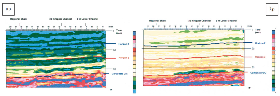 Figure 3 shows sections of λρ and μρ in a fluvial-clastic section over a carbonate unconformity in the Western Canadian Basin (Chen et al, 1998). Two proven gas sands are seen as low λρ (incompressibility) zones, while the carbonate unconformity is clearly seen as a change from low to high values of λρ. Combining the interpretation of the λρ section with interpretation of the μρ section increases the confidence that these anomalies are associated with sands. The relatively high values of μρ indicate that these are likely clean gas-sands, as proven by drilling.