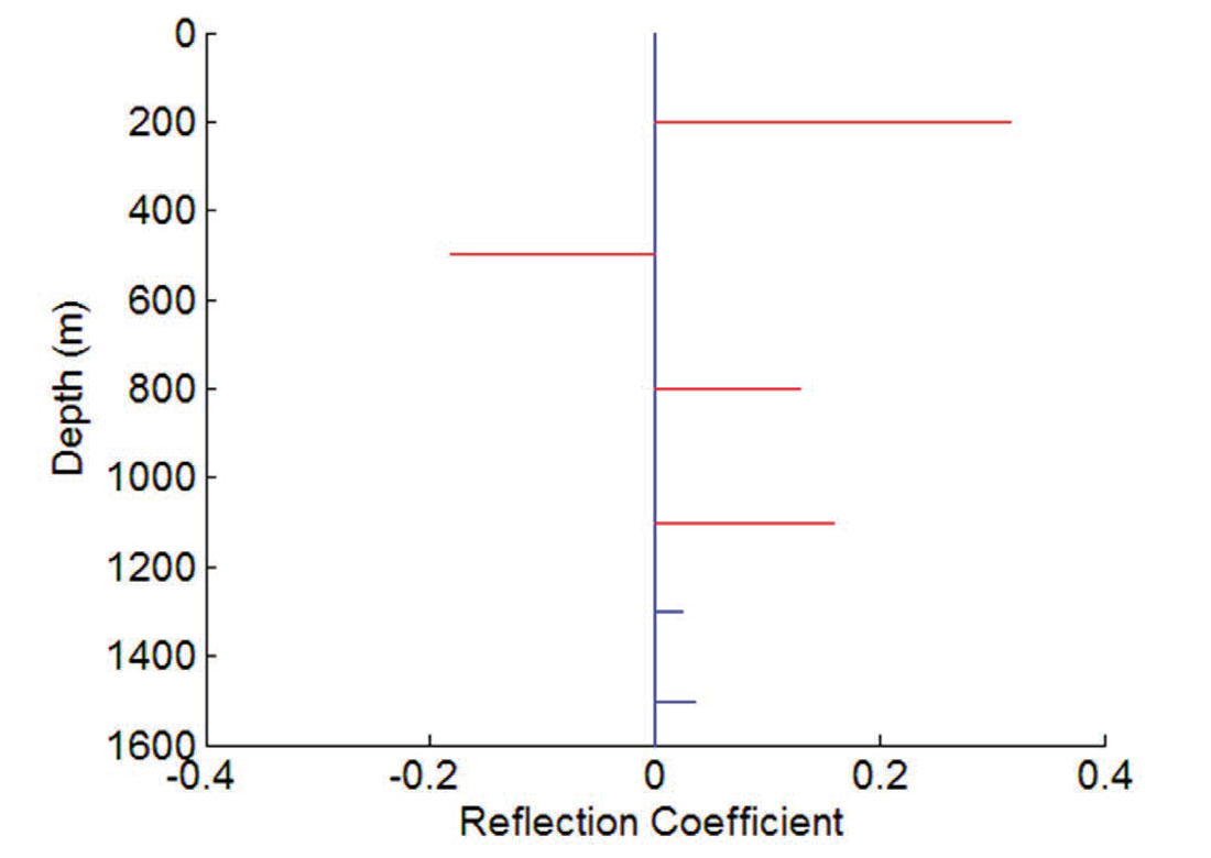The method used to create a synthetic shot record assumes a linear elastic isotropic medium. Within this medium, 1D ray tracing is used to determine the travel path and angles of incidence at reflection points which are inputs to the Zoeppritz equations used to calculate the AVO response. The 1D domain was chosen for its ease of use and simplicity since accounting for structural components and travel path variations would only add unnecessary complexity to an approach where there are sufficient variables that can be altered and still allow for meaningful conclusions. The Zoeppritz equations were chosen over an approximation for the forward modeling of amplitudes because of their accuracy. For the primary reflections a small angle approximation would suffice. However, in the case of multiples traveling through the medium and reflecting at various incident angles off of multiple boundaries, the slight deviations from the full solution due to an approximation will compound the inaccuracy of the multiples AVO. The modelling methodology uses a layered block model, where only first order multiples are considered. The parameters for the model can be found in Table 1. The zero offset reflection coefficients are displayed in Figure 1.