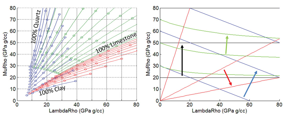 The first template in Figure App 1 shows three sets of dual mineral trends created using a non-interacting model (Perez, 2013). The three trends displayed are the quartz-clay in blue, quartz-limestone in green and limestone-clay in red. The model assumes spherical pores and no cracks where the trend lines that share a common colour are 10% increments of the noted two mineral mix. The circles along the trend lines display 10% porosity increments increasing towards the origin. Further detail on the models can be found in Perez (2013). The second template displays lines of constant Young’s Modulus, Poisson’s ratio, P-impedance and S-impedance in LMR space.