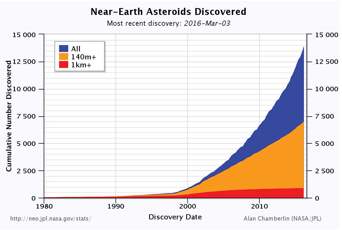 By the year 2011, CCDs of ever-increasing size and efficiency had revolutionized astronomy, 8,000 NEOs had been discovered (911 of them larger then 1 km), and NASA announced that the original Spaceguard goal had been surpassed: only an estimated 7% of all NEOs larger than 1 km remained to be discovered. Meanwhile, in 2005 the US Congress had passed the George E. Brown, Jr. NEO Survey Act, directing NASA to catalog 90% of all NEOs down to 140 meters in size by 2020. Asteroids this size are dangerous (a 140-meter impactor could devastate a region the size of small nation), and detecting them had already become feasible – thus, the 2005 directive could be considered an unusual instance of good sense on the part of the US Congress. The goal will probably not be met until a few years after 2020, but surveys continue to discover NEOs at increasing rates (Figure 2). More than 13,000 NEOs are now known, and none appears to be on an orbit that will impact Earth in the next century.