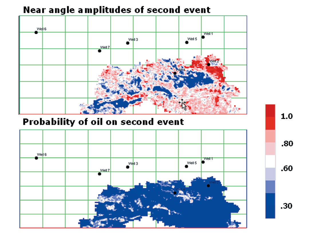Finally, using the scalers and stochastic models derived from the shallow horizon, we apply Bayes Theorem to the deeper target horizon. The result is shown in Figure 22. The higher probability regions never exceed about 60%, which is probably reasonable, given the uncertainty of the entire AVO process. Effectively, we have generated one more tool for evaluating drilling locations on the second horizon, which contains its own measure of reliability.