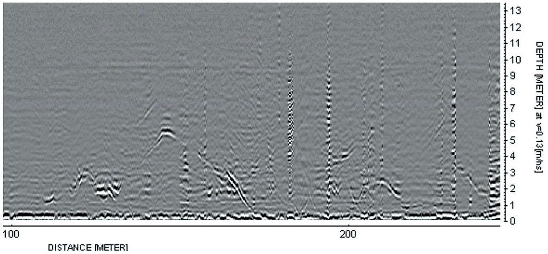 In 2002, a more concerted approach to loose detection was taken, and several consulting firms were contacted for proposals to determine a viable means of assessing the ground conditions above an opening in potash mines. GPR was recognized as the tool with the most promising success possibilities. Golders initial testing utilized Sensors and Software, and GSSI equipment and software. Both point and continuous testing was performed and data sets compared. Figure 5 illustrates a raw data response, and clearly indicated that GPR could be very effective in mapping out features in the Saskatchewan potash mine environment.